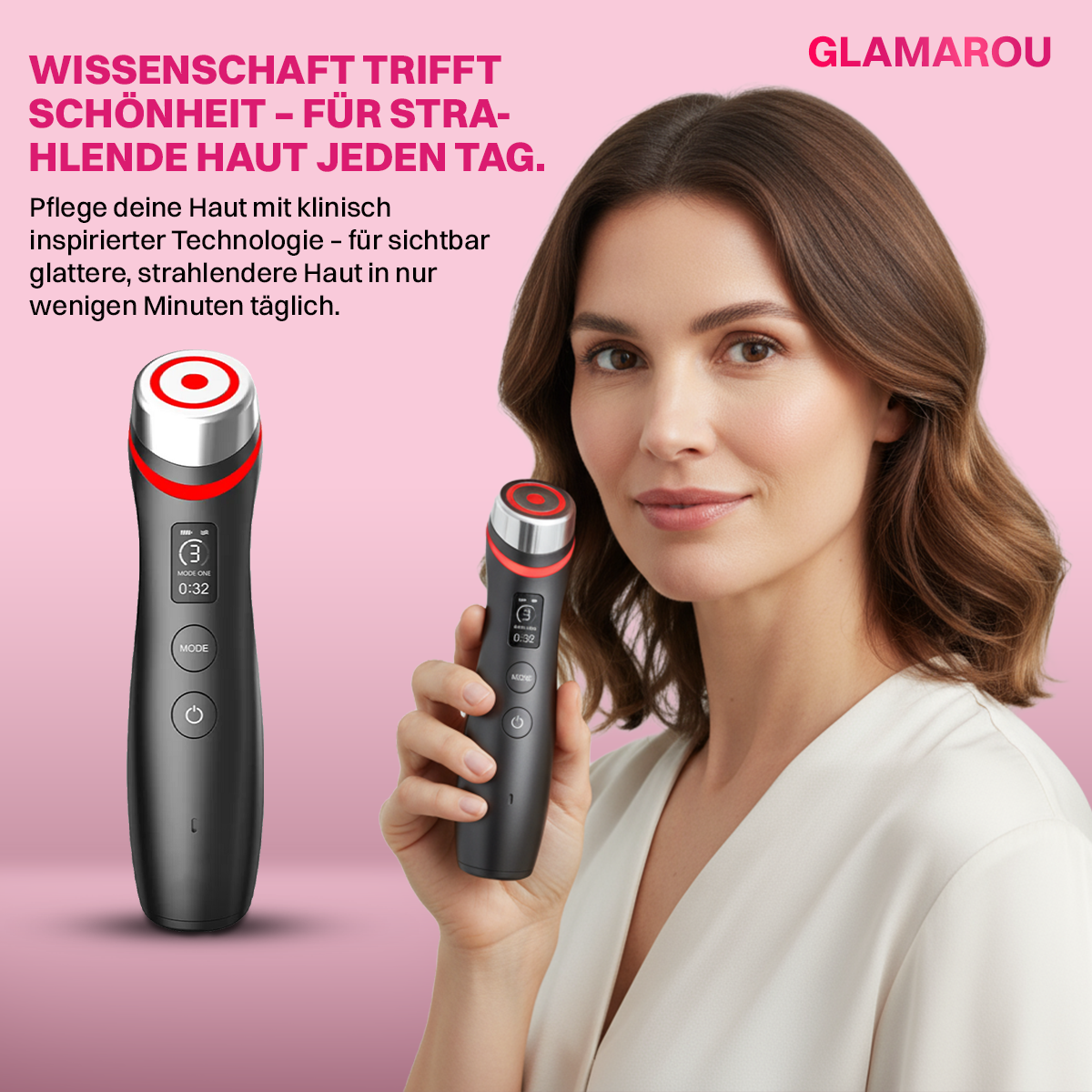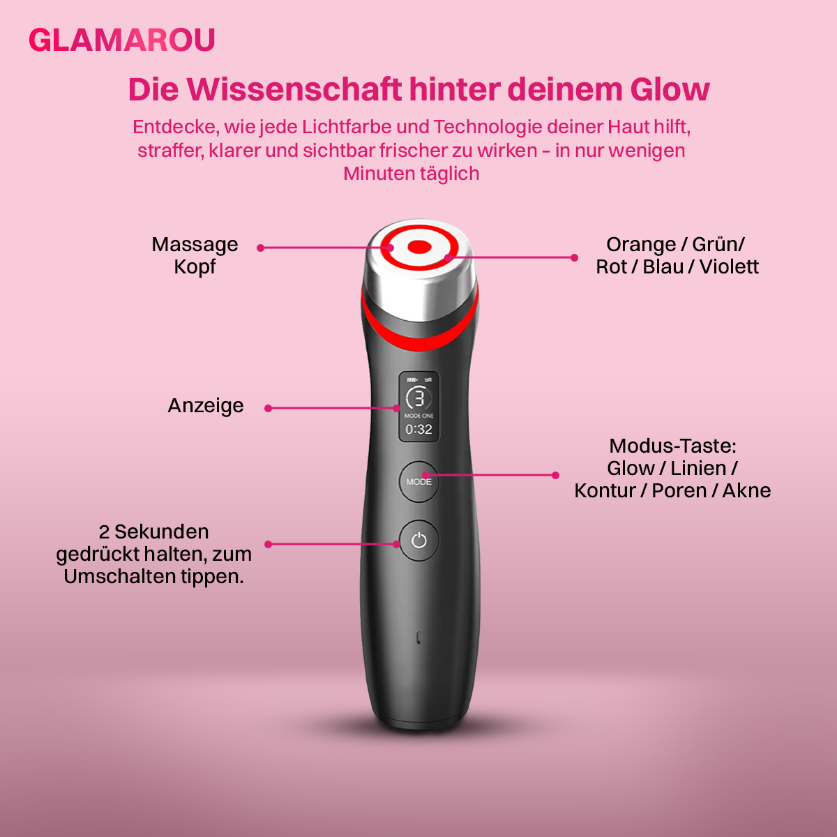 Die innovative 5-in-1-Technologie von Glamarou LumiGlow™ nutzt gezielte Lichtfrequenzen und Mikrostimulation, um deine Haut sichtbar zu regenerieren, zu straffen und zu verfeinern – wissenschaftlich inspiriert, sanft in der Anwendung.
